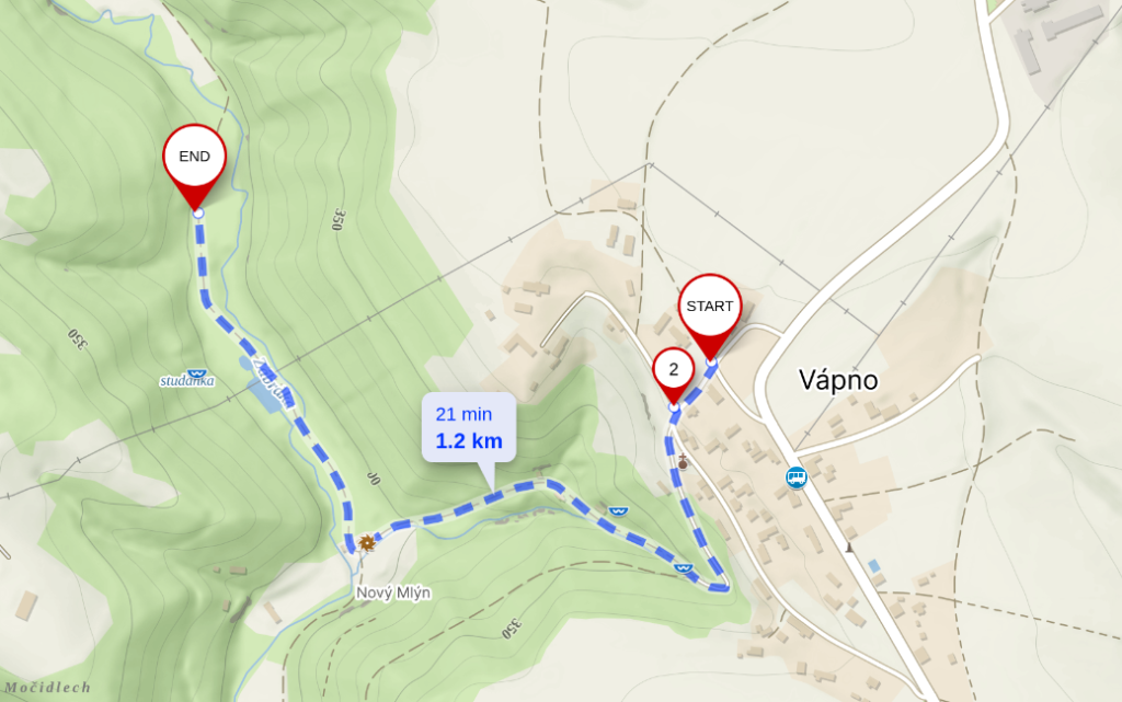 Zaparkujte ve Vápně (na jednom z vyznačených bodů by to mohlo jít nejlépe) a pokračujte podle mapky.